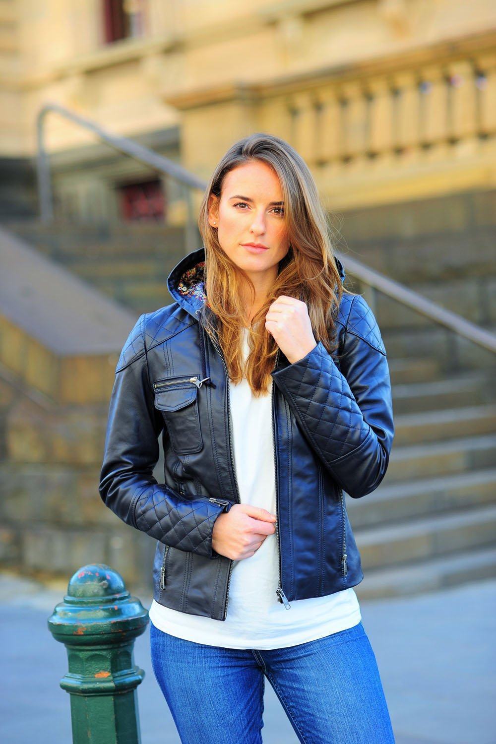 This stylish hoodie features the soft comfort of full grain sheep napa leather, pre-washed for a fluffy, gentle feel. The sturdy hood is designed not to droop when it's not being worn, and quilted panels create a gently snug fit. The slender cut won't bunch up; the adjustable hood and the gun metal zipper pull add a stylish, sporty touch. This clearly tops the list of our womens leather jackets.