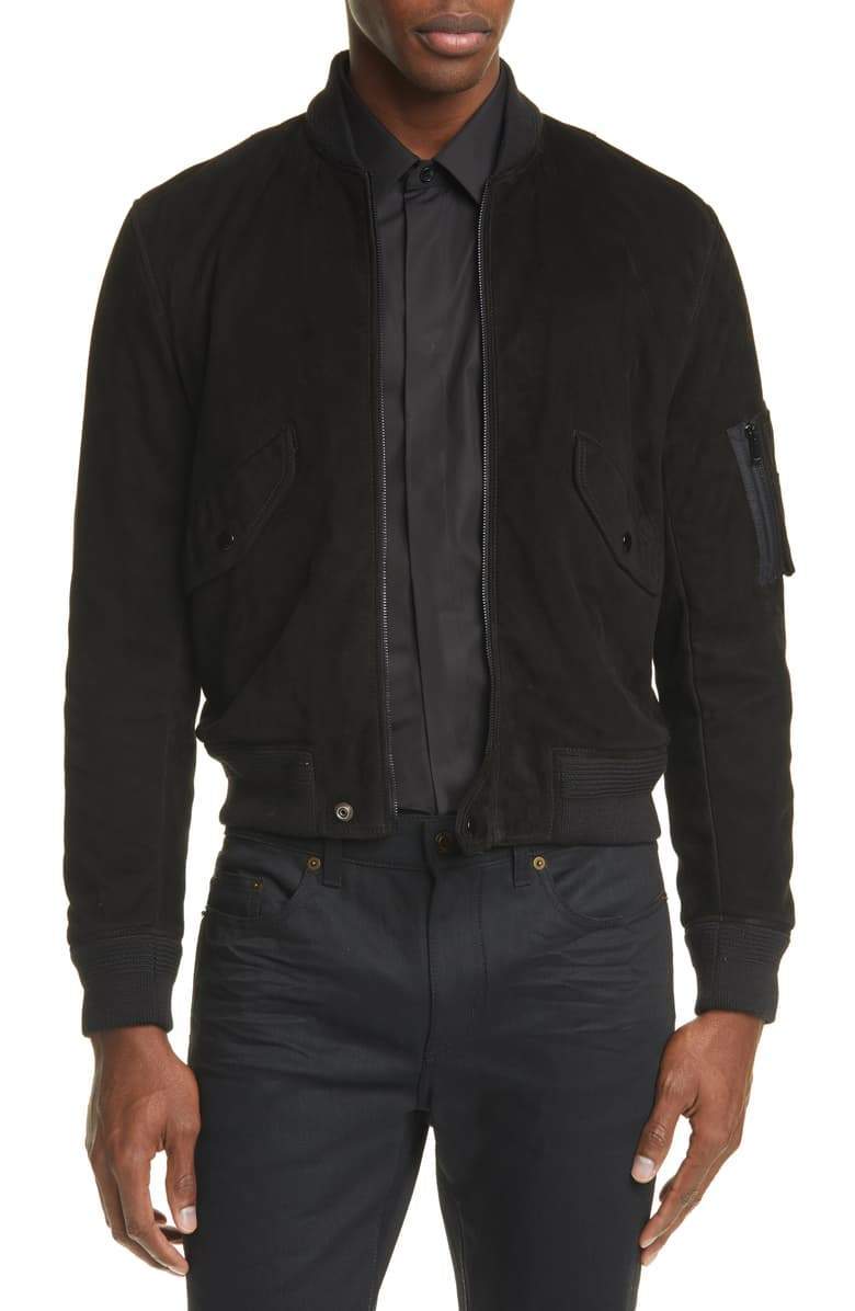 From Italy, a slimmer version of an MA-1 flight jacket stays close to the original with a zip cargo pocket on the sleeve, while soft suede make a sharp upgrade.