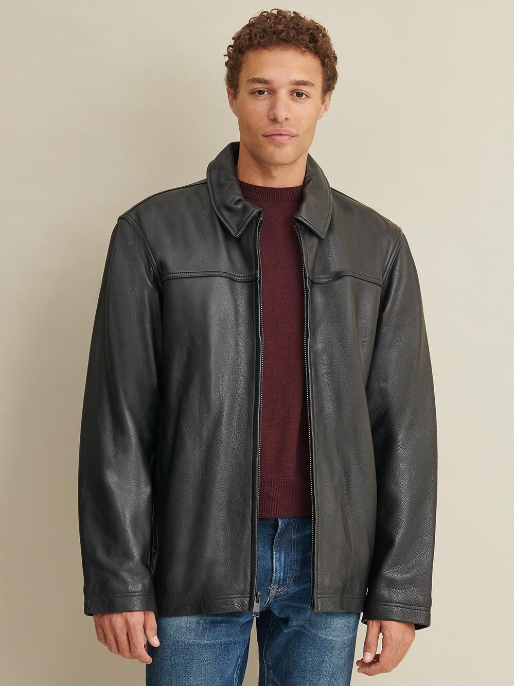 Modern yet rugged, this jacket keeps you looking your best. It's constructed from heavy-duty leather and detailed with raised seams. The basic zip front and shirt collar add to the jacket's ease and simplicity. All our Wilsons Leather brand jackets are timeless basics with a comfortable fit. Runs true to size.