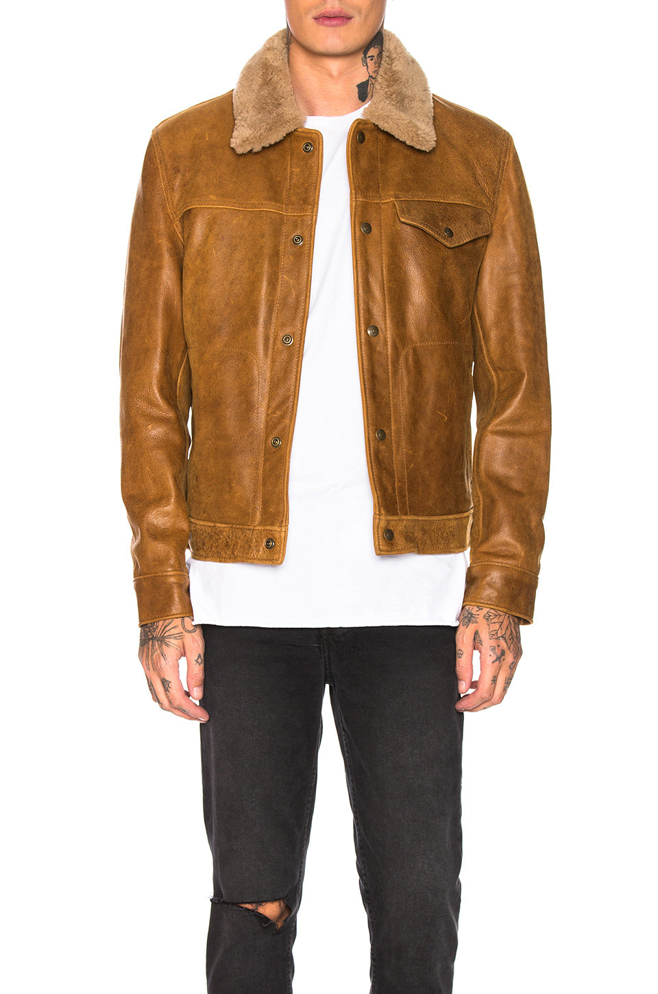 Self: 100% cowhide leatherCollar: 100% real dyed shearling furFaux Fur Lining: 58% acrylic, 23% modacrylic, 19% polySleeve Lining: 100% poly Fur Origin: Australia Professional leather cleaning only Snap button front closures Chest flap pocket with snap button closure Side welt pockets Faux fur sherpa lining Made in USA